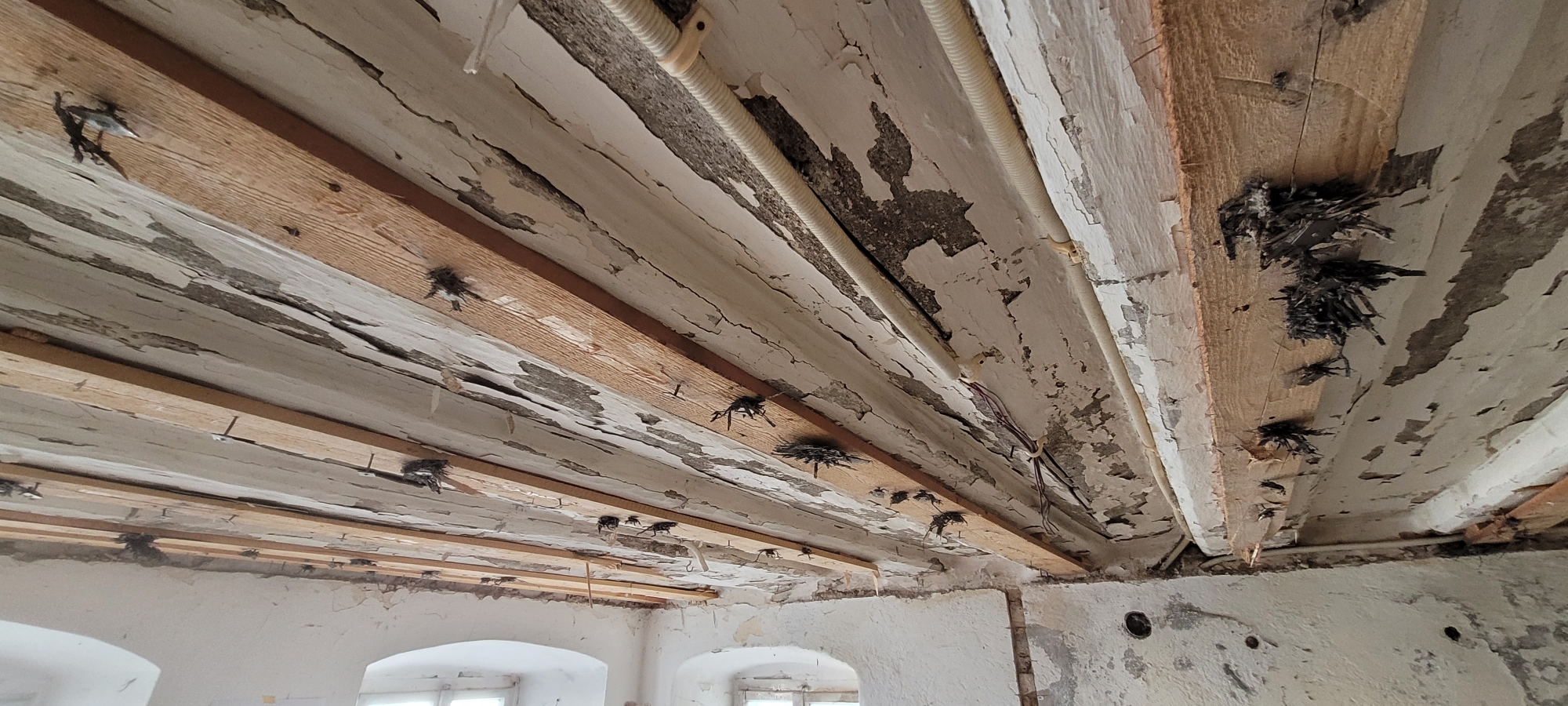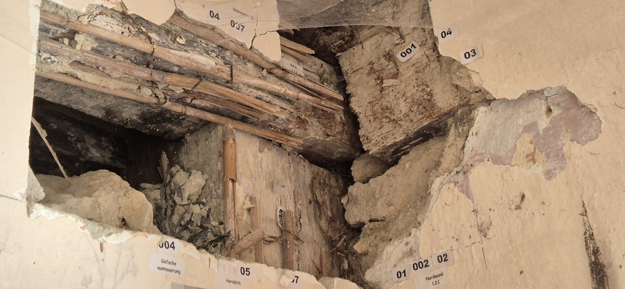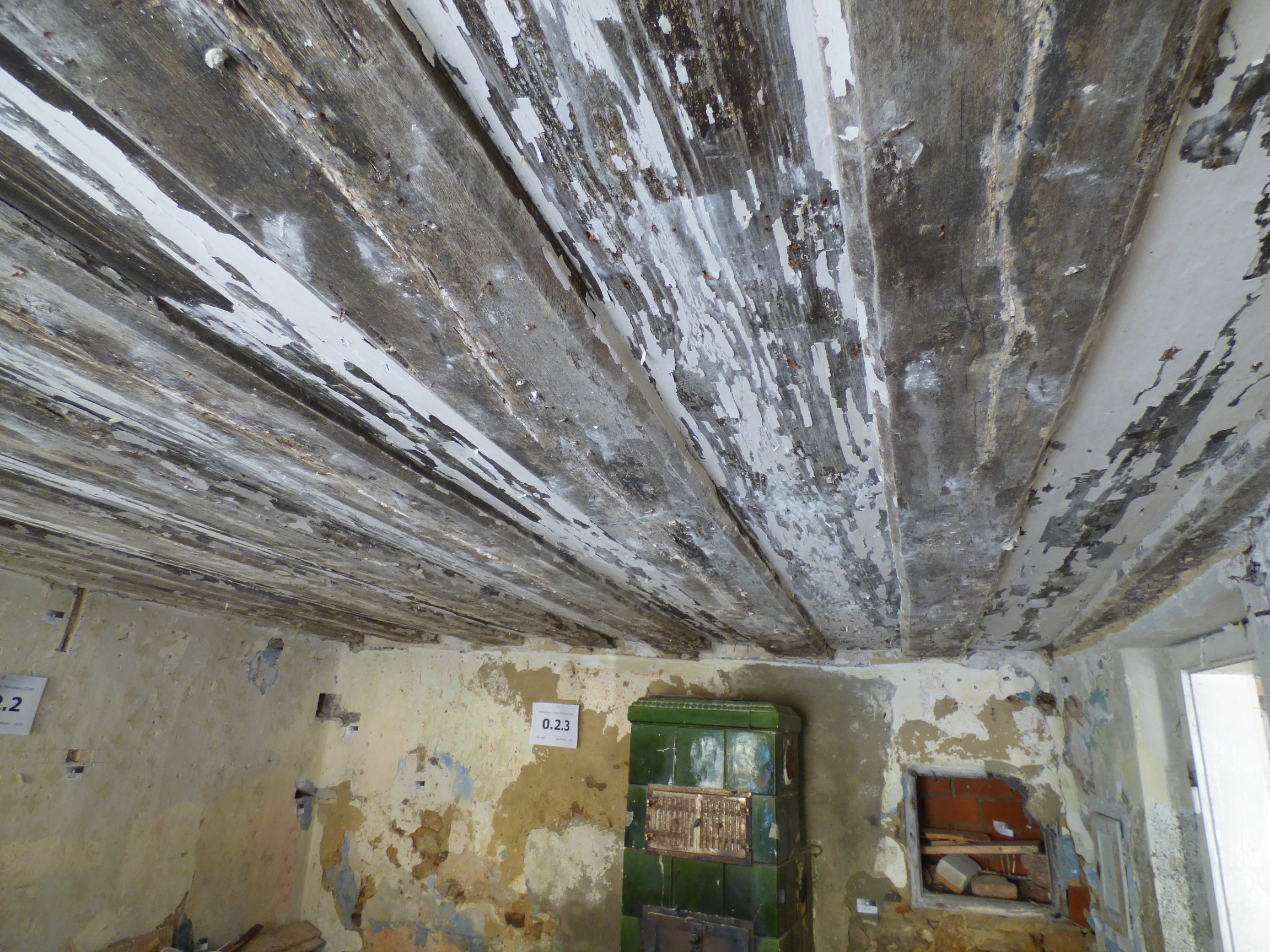 Auf den ersten Blick: Lehm, Steine, Scherben! Doch wir erkannten die teils hinter Schutt und Zementputz verborgenen historischen Schätze: Bohlen-Balken-Decken in beiden Häusern, eine „Rußkuchl“, ein Hausbrunnen im Keller, ein traumhaft schöner spätmittelalterlicher Dachstuhl. Und viel historische Bausubstanz, die es zu erhalten gilt.